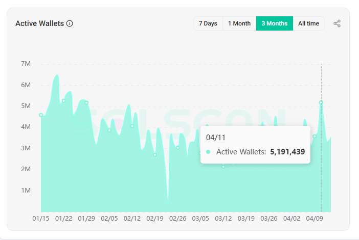 在这些异动的背后,4 月 11 日,Solana 链上活跃地址数再次突破 510 万个,接近 1 月份的峰值水平。