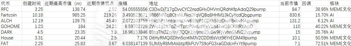 首先,在观测多个此前市值较高的代币之后 PANews 发现,本轮的 MEME 热潮并不具有普遍性,而是集中在几个特定的代币之中。多数此前市值过亿的 MEME(如 Trump、BONK、WIF、POPCAT)仍处于下滑或底部震荡阶段。在 PANews 统计的几个代币当中,除了 Fartcoin 之外,其他的代币要么是近 1~2 个月内诞生的新币,要么则是发行之后一直不温不火的代币。以下是 PANews 观测的几个代币:RFC、Fartcoin、ALCH、GOHOME、DARK、House、FAT。