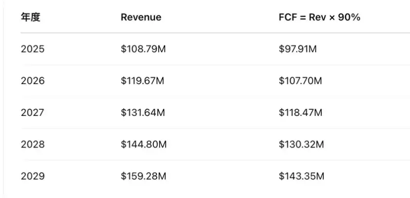 2024 年 Raydium 的 Revenue 为 98.9m,假如年增长率为 10%,贴现率为 15%,预测年限 5 年,永续增长率 3%,FCF 转换率 90%。