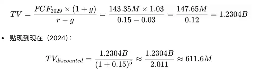 DCF 总估值 = TV + FCF = 611.6m + 390.3m = 1.002B