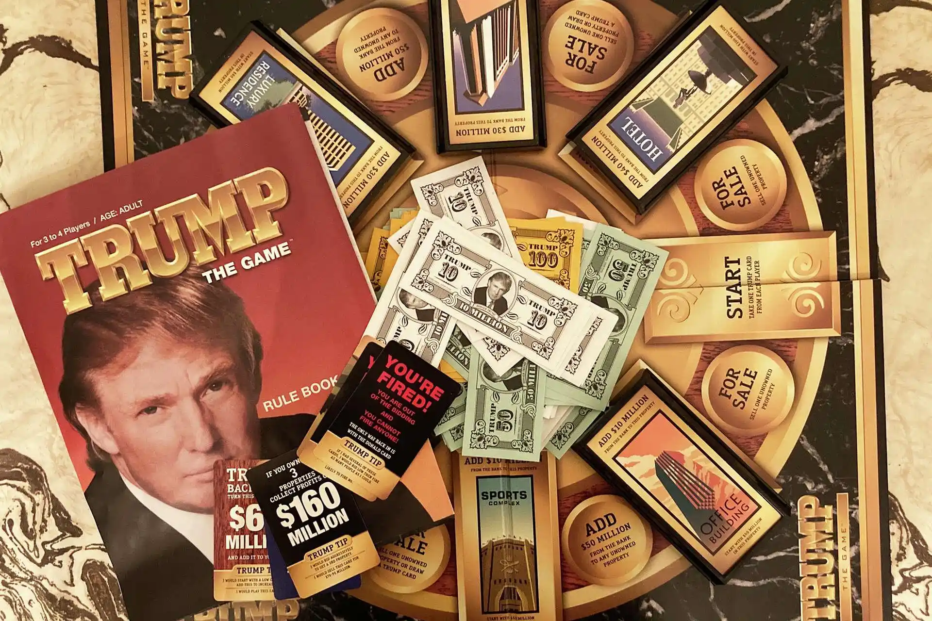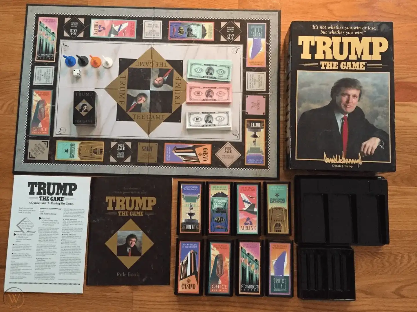 1989 年 5 月,唐纳德·特朗普与老牌棋盘游戏公司米尔顿·布拉德利合作推出桌游《特朗普:游戏》(Trump: The Game),设计灵感源自《大富翁》和特朗普本人的房地产大亨生涯。时任米尔顿·布拉德利公司总裁的 Milton Bradley 曾表示,该游戏以高风险赌局、交易以及特朗普于 1987 年推出的畅销书《交易的艺术》(The Art of the Deal)作为背景。特朗普还为游戏拍摄电视广告,并打出了「重要的不是输赢,而是赢不赢!」的宣传口号。