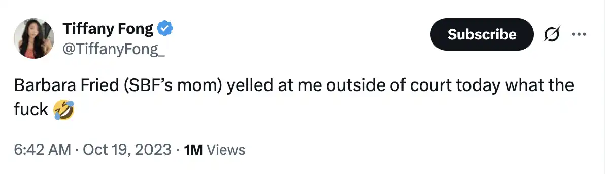 要说 Tiffany 与马斯克如何搭上关系,还得回到 2023 年十月 SBF 的庭审现场。彼时庭审刚刚结束,SBF 的父母准备离场,Tiffany 看到二位老人本想上前安慰一番,没想到 SBF 的母亲 Barbara Fried 对着 Tiffany 情绪激动的大喊大叫起来,称 Tiffany 的报道害了 SBF。