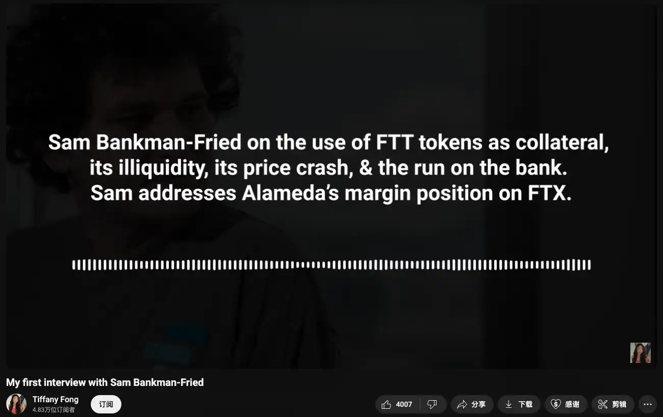 这段通话后来发布在她的 YouTube 频道,其中一段尤其引发轰动,SBF 承认曾秘密向共和党捐赠了大量政治资金,这句话后来被写进了美国联邦选举委员会对他的正式投诉文书。但采访 SBF 的 Tiffany 当时并不知道那段发言会带来什么后果。