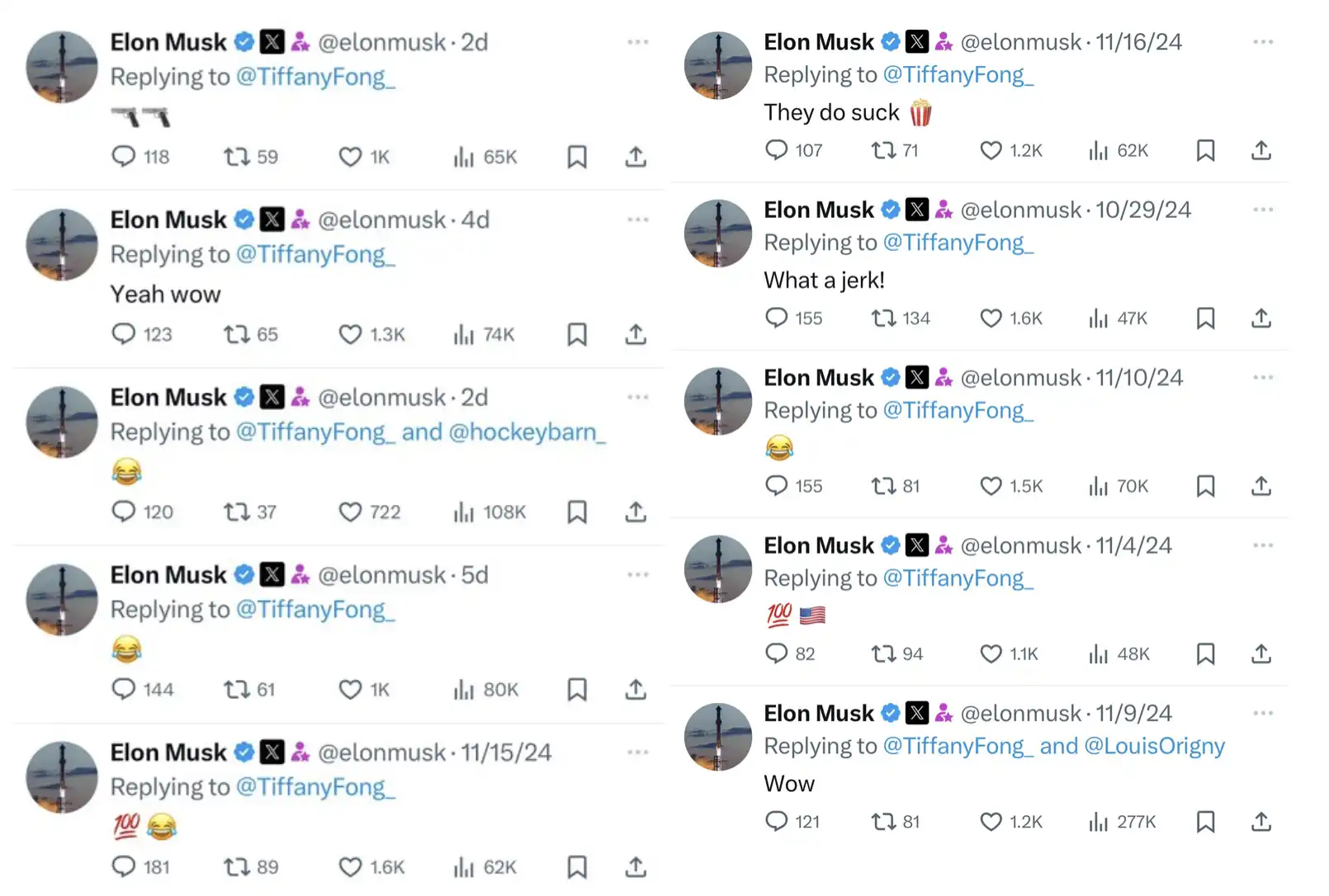 Twitter 上拥有 34 万粉丝的女 KOL Tiffany Fong 最近陷入了一段莫名其妙的绯闻中,《华尔街日报》日前发文称马斯克曾私信 Tiffany 求子遭拒。