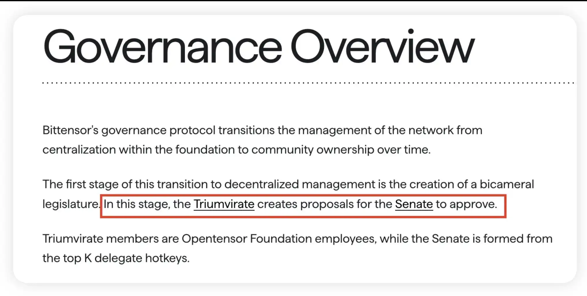 至于所谓的「三巨头+参议院」二元治理结构,三巨头是 Opentensor Foundation 的三名员工,参议院是排名前 12 的验证节点,全部都是自己人或者利益相关方。