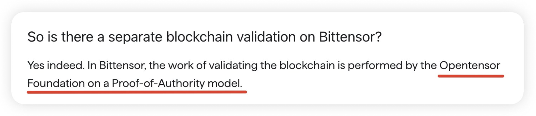 首先,Bittensor 虽然官方一直标榜自己是一个「公平挖矿」的项目,但实际上底层 Subtensor 既不是 PoW 公链,也不是 PoS 公链;而是一个由 Opentensor Foundation(Bittensor 的基金会)负责的单机链,机制非常黑盒。