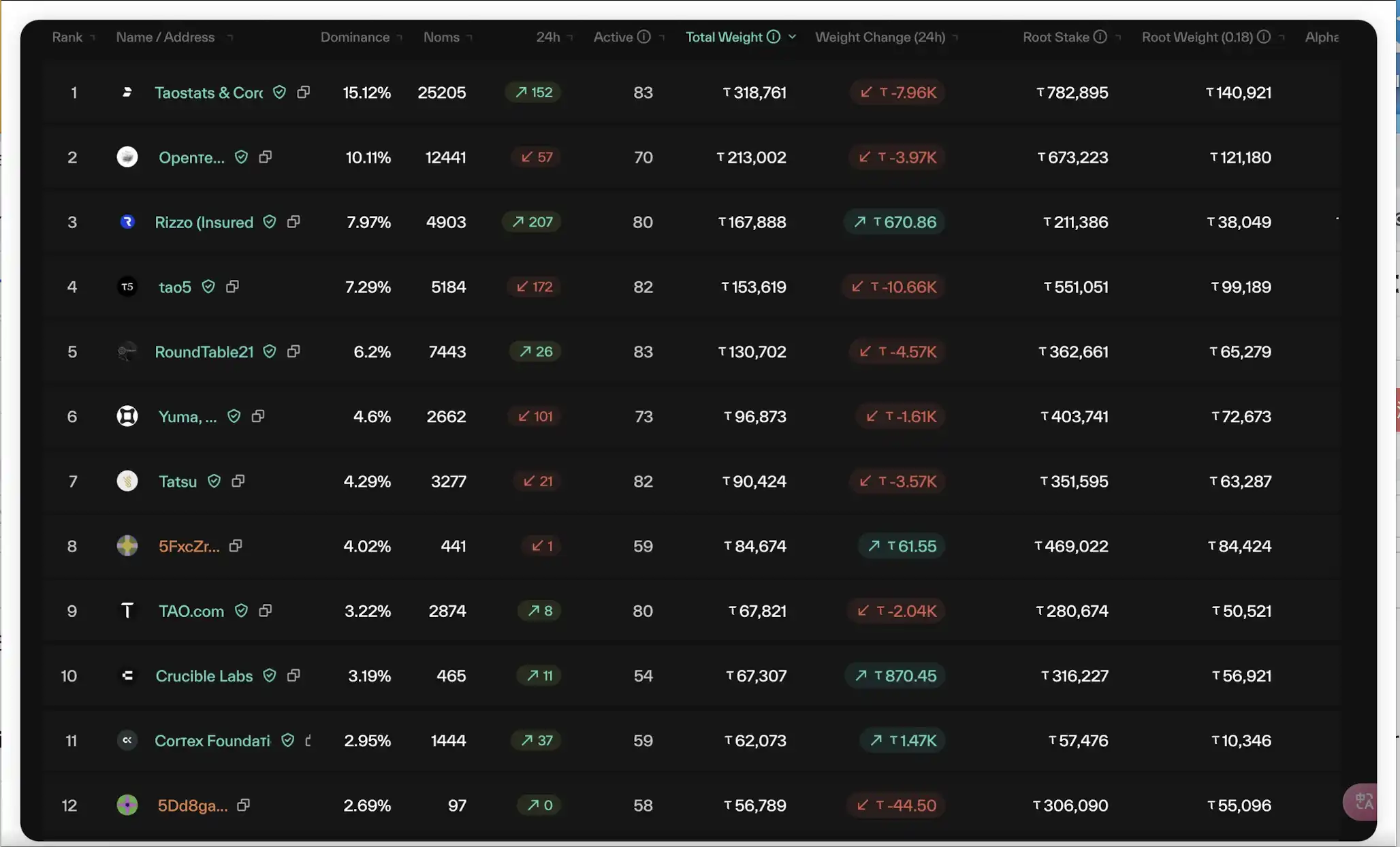因此,子网所有者不仅不能从 dTAO 模型中获得任何收入,甚至不得不补贴它:创造外部收入并将其注入到它们的子网 Alpha 代币中。这意味着,子网项目方和矿工本质上都是在为验证节点打工。验证节点作为 Bittensor 网络的特权阶级,不仅不能做有任何价值的事情,而且从 dTAO 升级一开始就可以持续不停地卖出子网 Alpha 代币,流向根网络的 TAO 占每天排放的高达 1/3。