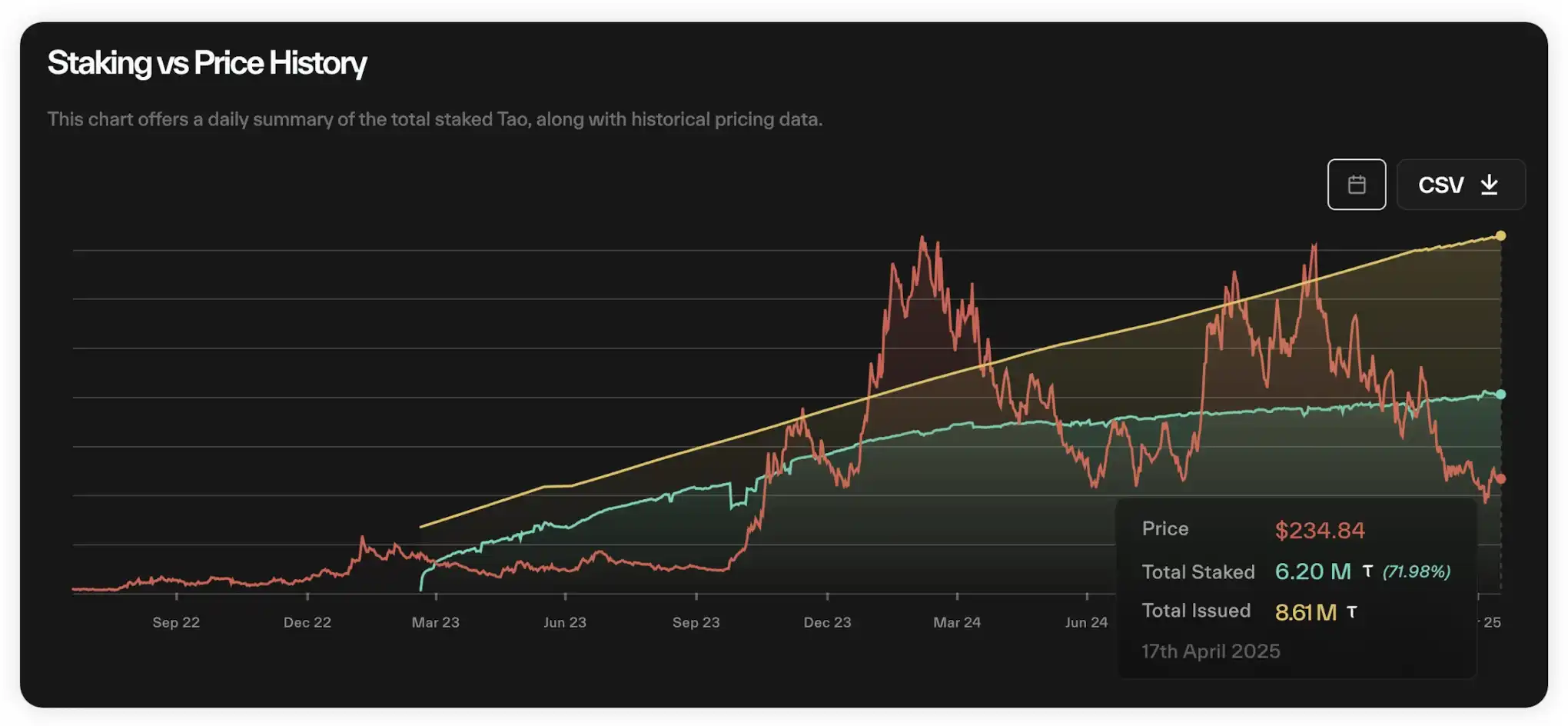 下面这张图展示了 TAO 的历史质押情况,千万不要被它骗了,以为 TAO 的质押率是从低到高慢慢变多的。之所以这么画,是因为 TAO 在剧烈通胀。