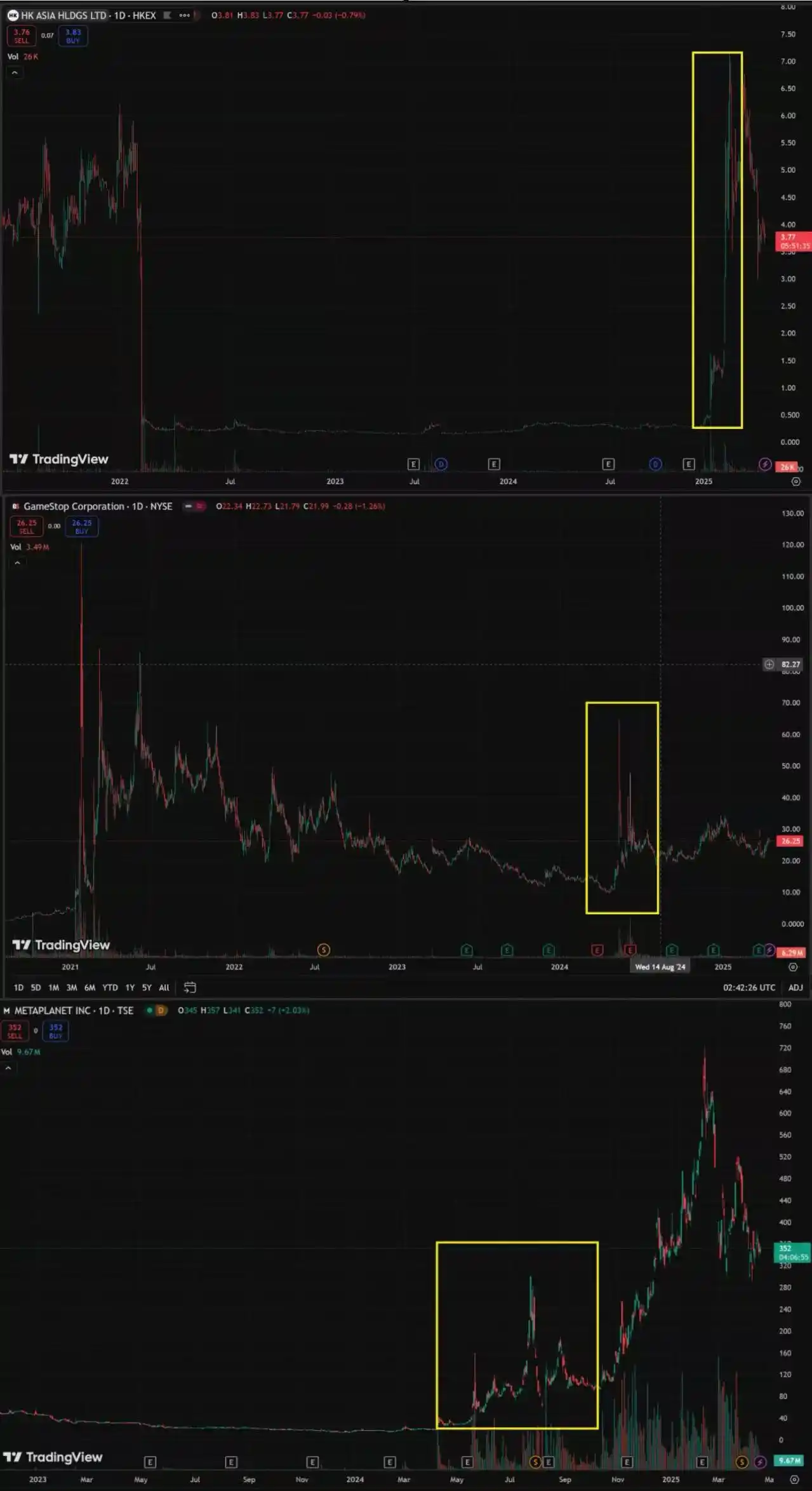 从股市的角度看,美股市场流动性强,Saylor 的操作往往能迅速反映在股价上。而港亚控股受限于港股市场的低流动性,小盘股容易被操纵,走势更多由散户情绪主导。Metaplanet 则受到日本市场本身天花板的限制,成长空间相对有限。