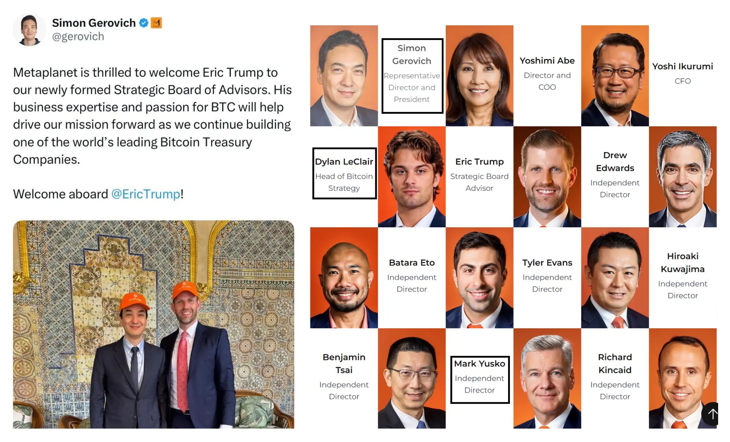 左:Eric 和 simon 的合影,右:Metaplanet 核心成员;图源来自:X、Metaplanet