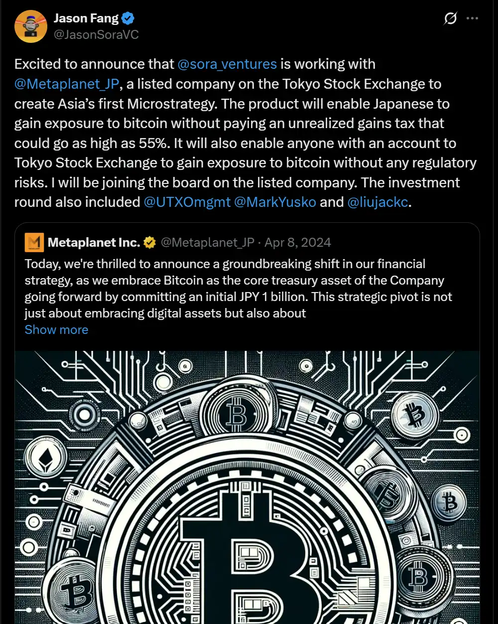 2024 年 4 月,Sora Ventures 的创始人 Jason Fang 在个人推特账号上写道:Metaplanet 是「亚洲第一个微策略」,并通过与 UTXO Management、Mark Yusko 等的合作,帮助 Metaplanet 将比特币纳入资产负债表,成为日本首家公开持币的上市公司。