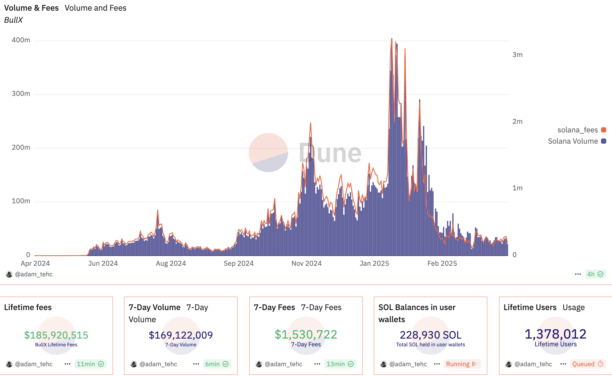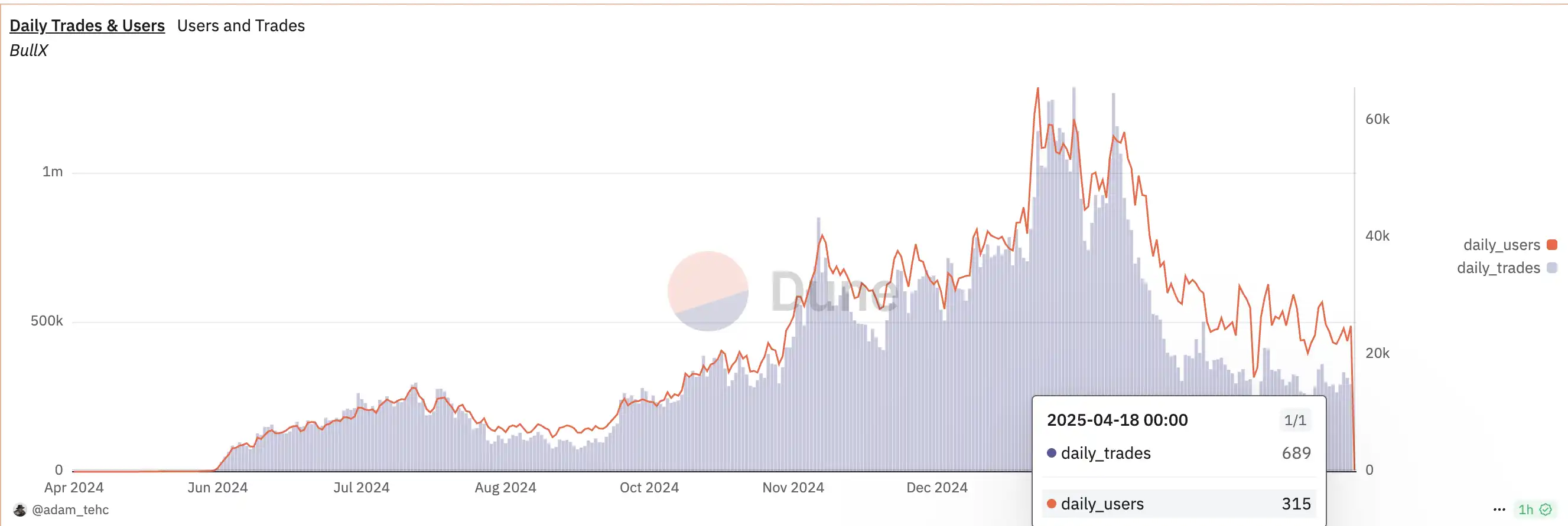 尽管 Nuotrix 的证据并不明朗,但自 2 月 10 日 BullX 发布对第三方 chrome 扩展集成的抵制的文章之后,官方便再也没有在社交媒体上发布推文,两个月没有发布推文加之这次传播广泛的 FUD 情绪让人担忧,无论如何首先保证资金安全是首要,因此 BullX 的用户量也从前日的 25000 人降至 300 余人,而交易手续费收益也从昨日的 25 万美元降至 8000 美元。