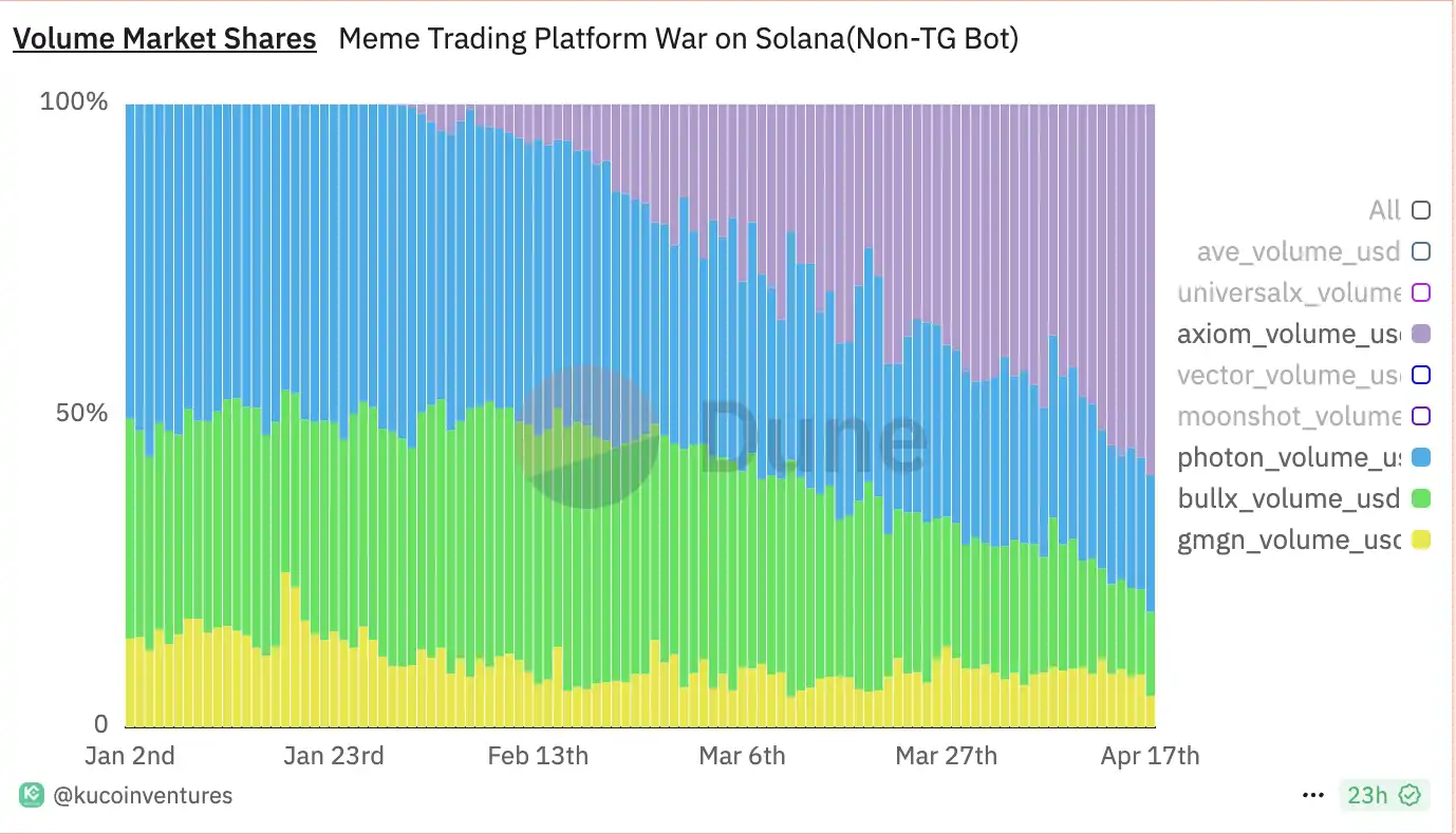 而今年 2 月更是一度超越老牌交易机器人光子 Photon 成为市占率第一,直到 YC 投资的 Axiom 开始发力异军突起,至此市场形成三足鼎立的趋势。