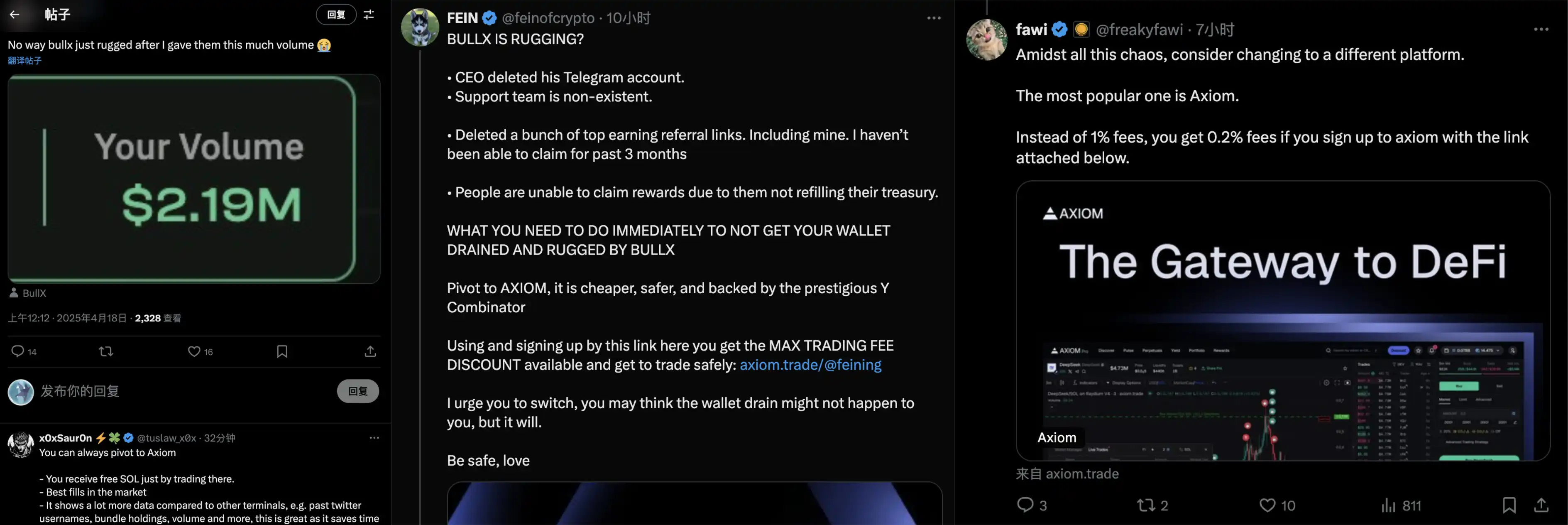 随着交易机器人成为这个周期「最被需要」的应用之一,越来越多的同类产品出现在市场上,后来者会在各种方面「卷」前者。而前者在经历红利期之后,很有可能因为倦怠产品跟不上时代,像是本次 FUD 事件中最多出现的,就是交易机器人中超新星 Axiom 的邀请码。