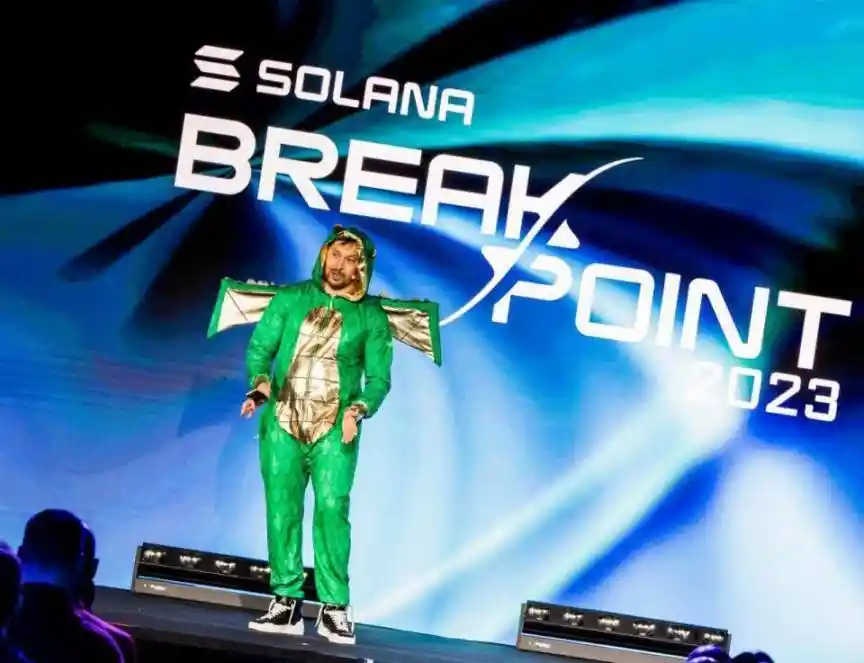 2019-2023 年间,Solana 获得 a16z、Multicoin Capital 等投资支持,通过 grant 和孵化器吸引 DeFi 和 MEME 币开发者;Solana 的 Breakpoint 大会也会时常成为 Meme 币的灵感来源,还记得前年 Toly 在大会上穿着绿色卡通龙形象服装,引爆之后一波对现象级 Meme SillyDragon 的关注么?