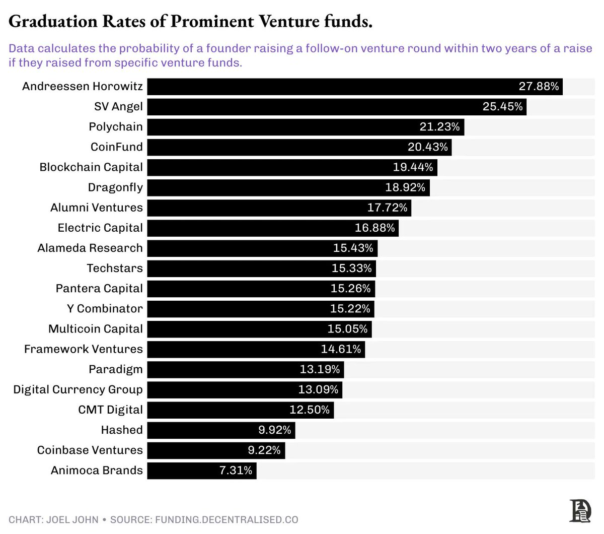 2. 对创始人来说,了解资本流向只是第一步。更重要的是理解这些基金的表现如何,以及他们通常与谁共同投资。为了弄清这一点,我们计算了某家基金投资后获得后续融资的历史概率,尽管在后期阶段(如 B 轮)数据会变得模糊,因为公司往往发行代币而非传统股权融资。