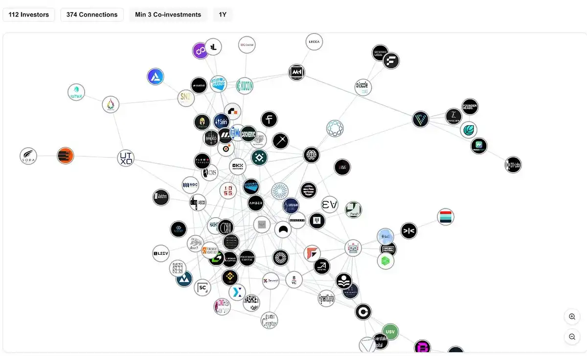 另一种研究数据的方式是通过分析最活跃投资者的行为。上面的矩阵考虑了自 2020 年以来投资次数最多的基金,以及它们之间的关系如何展开。你会注意到,加速器(如 Y Combinator 或 Outlier Venture)与交易所(如 Coinbase Ventures)的共同投资很少。