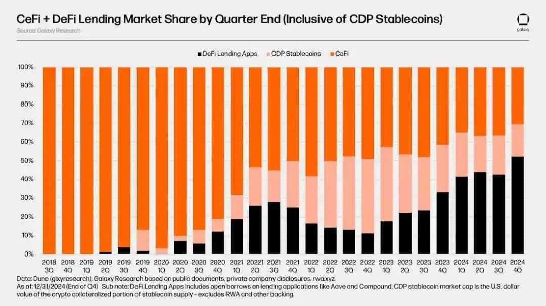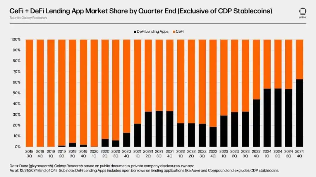 加密借贷市场的一个显著变化是 DeFi 借贷应用在熊市中表现出比 CeFi 平台更强的主导地位,并在市场复苏过程中继续扩张。2020-2021 年牛市周期中,排除加密货币担保 CDP 稳定币的市场资本时,DeFi 借贷应用占总加密货币借款的份额仅为 34%;而截至 2024 年第四季度,DeFi 借贷应用的市场份额已上升至 63%,几乎是其原份额的两倍。