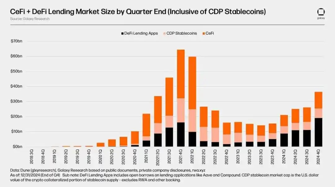加密借贷市场的总体规模仍然显著低于 2020-2021 年加密牛市尾期的峰值。截至 2024 年第四季度,包括加密担保债务头寸(CDP)稳定币在内的加密借贷市场规模为 365 亿美元,相较于 2021 年第四季度创下的 644 亿美元历史最高点下降了 43%。这一下降可以归因于借贷方在供应端的崩溃,以及资金、个人和企业在需求端的萎缩。