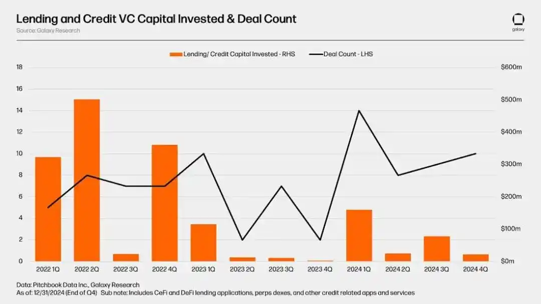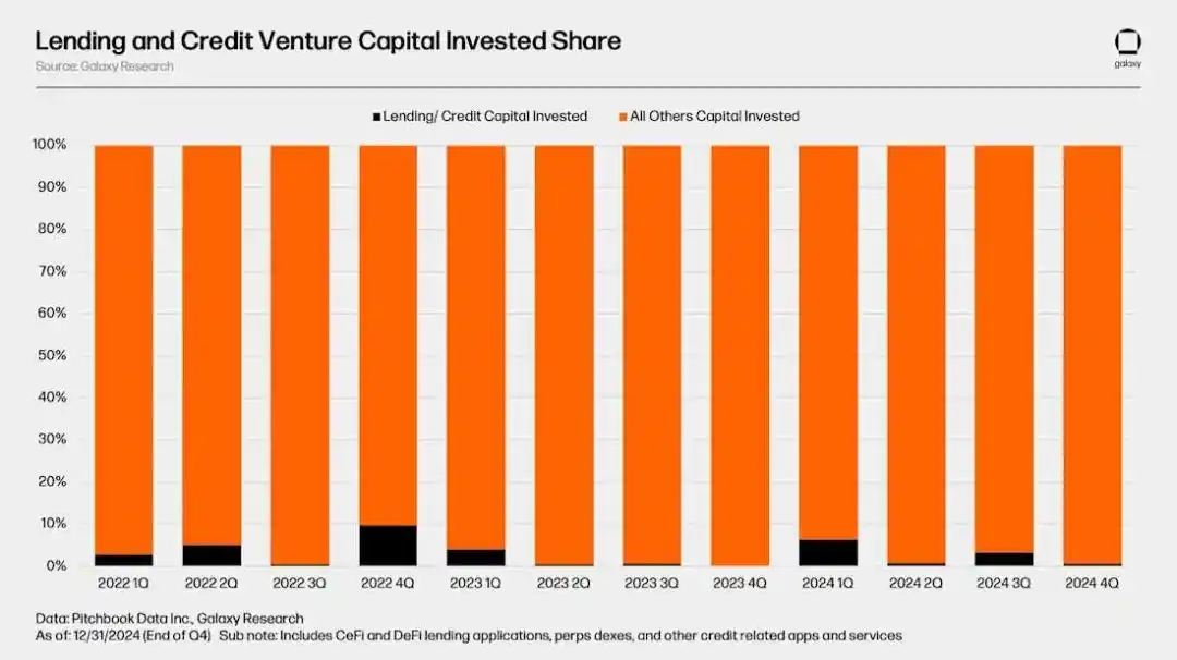 对于加密经济体,风险投资对借贷和信用应用的投资仅占总投资的一个小部分。从 2022 年第一季度到 2024 年第四季度,借贷和信用应用平均每季度仅占风险投资资本的 2.8%。借贷和信用应用在 2022 年第四季度曾占据总季度资金的 9.75%,为其最大份额;而在最近的 2024 年第四季度,所占份额仅为 0.62%。