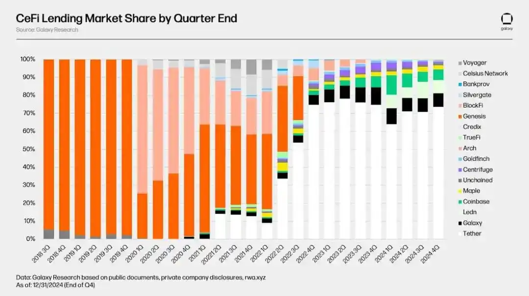 截至 2024 年第四季度,加密借贷市场总规模 365 亿美元,排名前 3 的中心化金融(CeFi)借贷机构包括 Tether、Galaxy 和 Ledn,这三家公司在 2024 年第四季度末的贷款账面规模达到了 99 亿美元,占 CeFi 借贷市场的 88.6%(Tether 其中占比大概 73% 达 82 亿),而市场规模主要构成比例为: