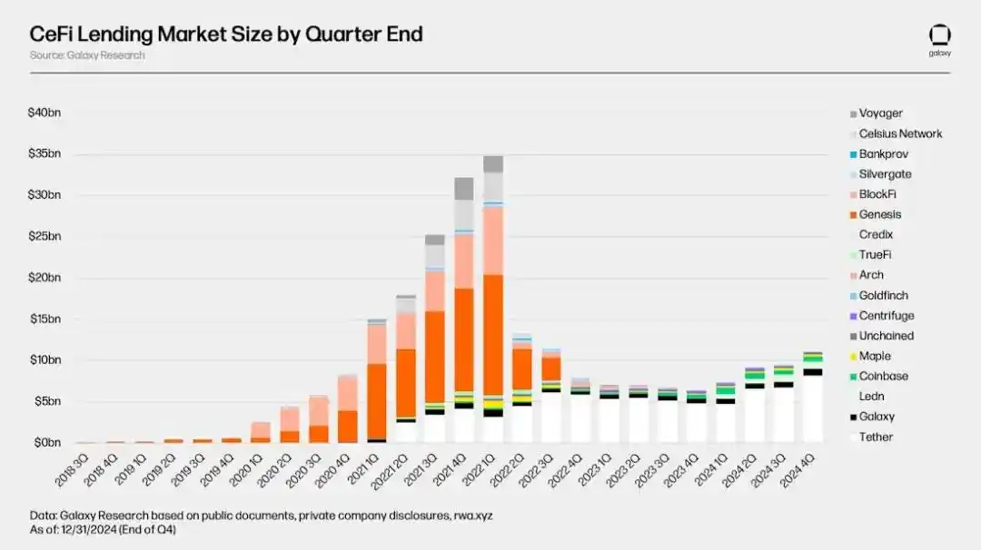 在市场高峰期,Galaxy Research 估计,具有可获取数据的 CeFi 借贷平台的总贷款账面规模为 348 亿美元;而在市场低谷时,CeFi 借贷市场的规模降至 64 亿美元(下降了 82%)。截至 2024 年第四季度末,CeFi 借贷市场的总规模为 112 亿美元,相较历史最高点下降了 68%,但较熊市低谷时增长了 73%。