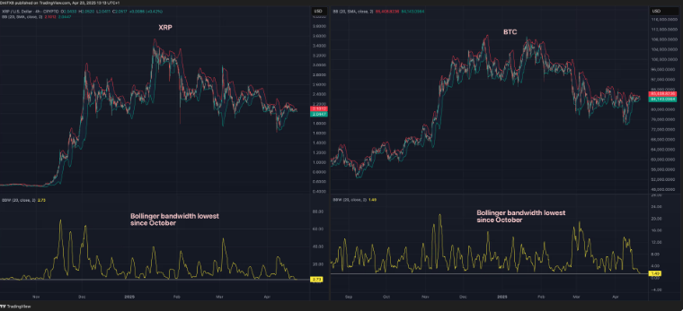 在 XRP 的 4 小时 K 线图上(每根蜡烛代表 4 小时的价格走势),布林带带宽已收窄至 2024 年 10 月以来的最低水平。4 小时 K 线在 24/7 运作的加密货币市场中颇受欢迎,交易者常用它来分析和预测短期价格走势。而比特币的 4 小时 K 线图也呈现出与 XRP 相似的布林带带宽形态。
