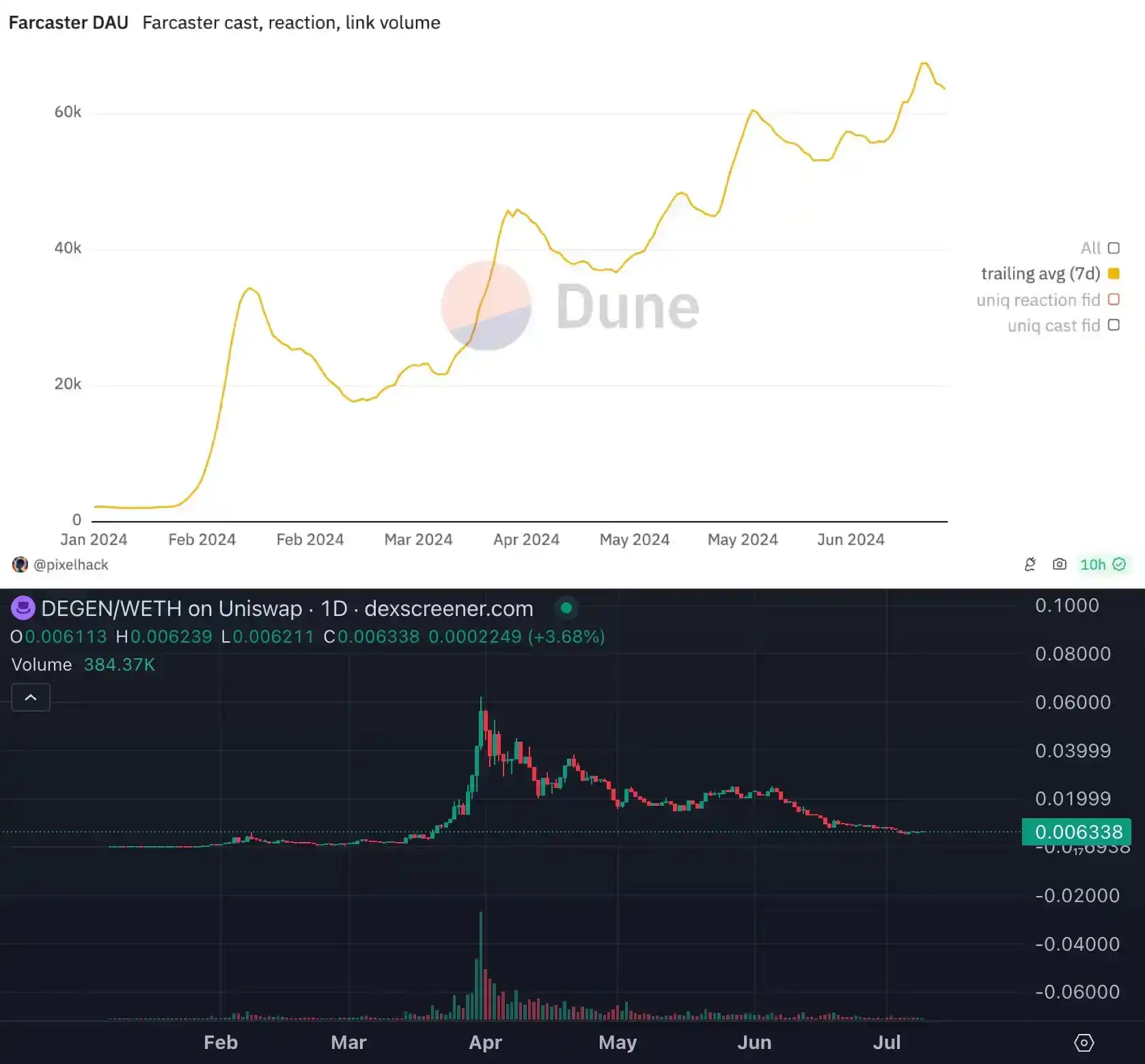2024 年 2 月,社交代币$DEGEN 在 Warpcast 中名为 Degen 的频道中走红,成为 Farcaster 破圈的主要推动力。彼时 Farcaster 放开网络注册才仅四个月,每日活跃用户突破 3 万人。随着$DEGEN 代币发酵、以及出现诸如 Higher 等同类受欢迎的频道代币,Farcaster 的日活最高触及 7 万人。