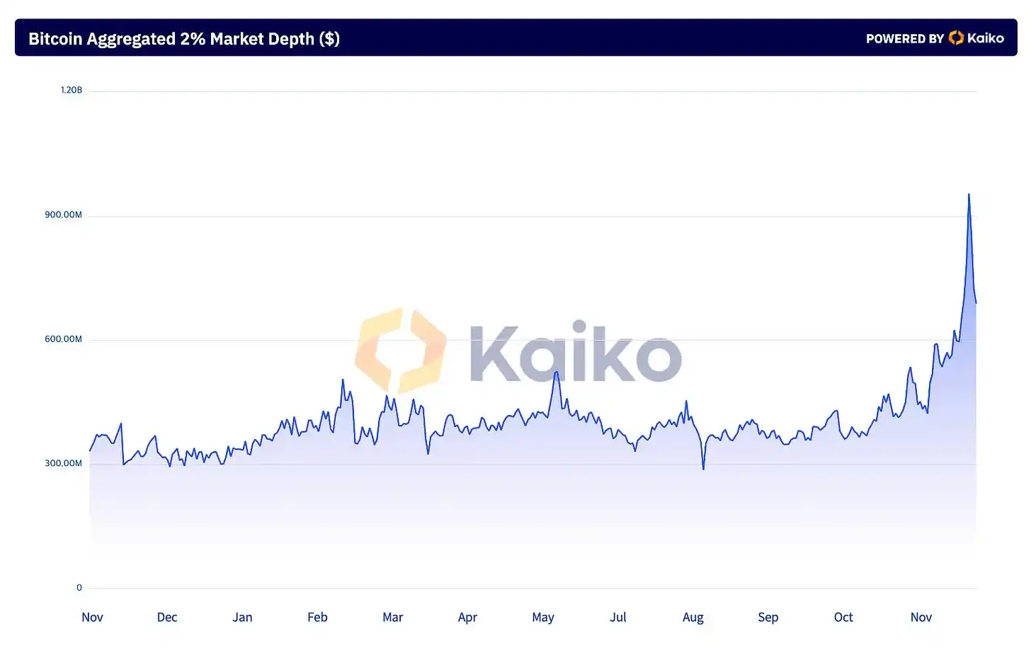 尽管企业在变现比特币时仍担心可能对价格产生影响,但随着市场深度的增加,这一问题正在逐步缓解。据 Kaiko 数据显示,比特币的「2% 市场深度」(即当前市场价格上下 2% 范围内买卖订单的总金额)在过去一年中稳步增长,日均市场深度已达到约 400 万美元。这表明,比特币市场的流动性和稳定性正在持续改善,为企业使用比特币创造了更有利的环境。