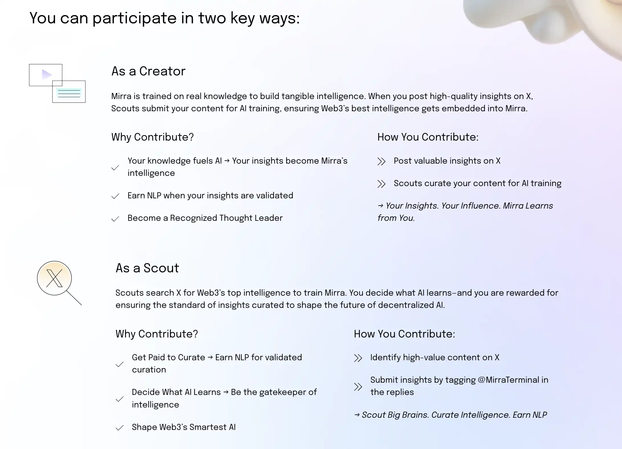Mirra 是一个基于精选数据进行训练的去中心化 AI 模型,目前 Mirra 分为两种参与模式,用户可以成为一个 Creator 内容创作者,仅仅需要在 X 上持续分享内容就行,这个模式逻辑类似与 Kaito,但更加自由更没有目的性。第二种就是 Scout 侦察兵,在优质的内容下 Tag Mirra 来学习,如果这个值得学习则用户能获得 NLP。目前不清楚其盈利模式,可能有多种可采用的模式,其中一个就是接入其他需要市场情绪或判断力的工具中,如 DEFAI 等。