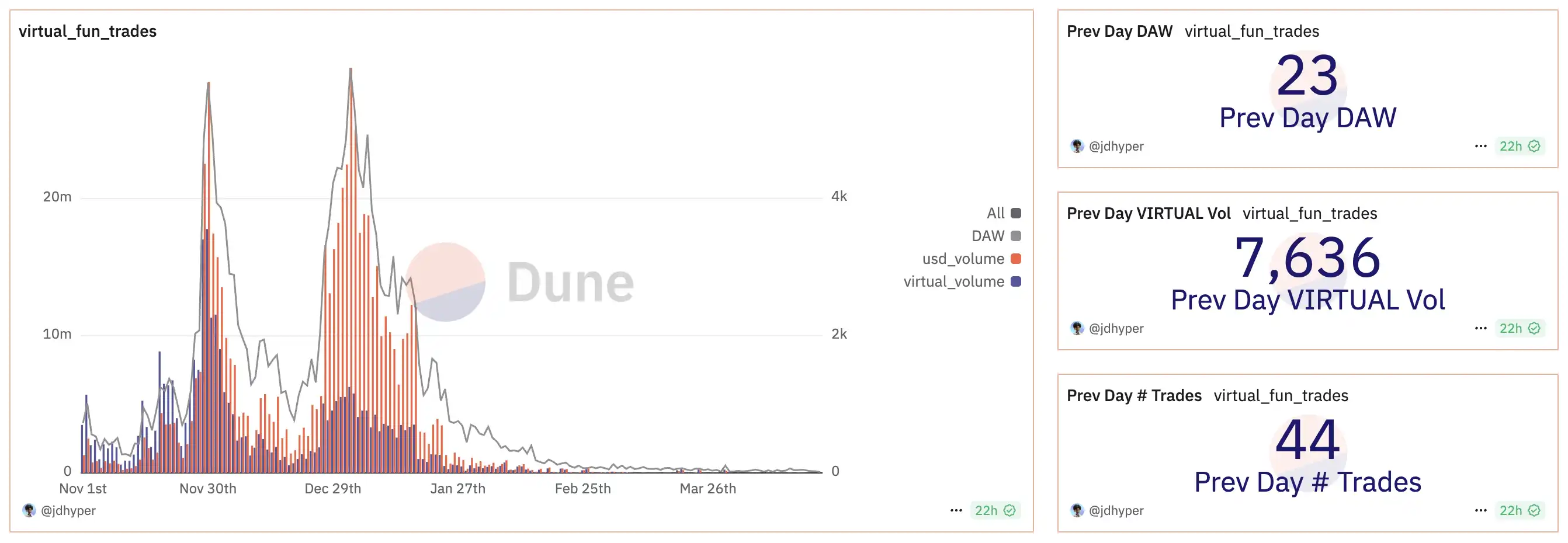 作为上个周期生态搭建与价值飞轮结合的最完善的 AI 项目之一,Virtuals Protocol 的币价随着市场的沉寂飞轮的旋转速度也放缓了,随之而来的是价值 45 亿美元市值的泡沫被戳破,跌幅超过了 90%,而发射器的参与者也大幅降低。但 Virtuals 没有放弃,在这个 AI 的熊市,他们开始 Build,而如今 Virtuals 的市值已经回到了 10 亿美元的关口。