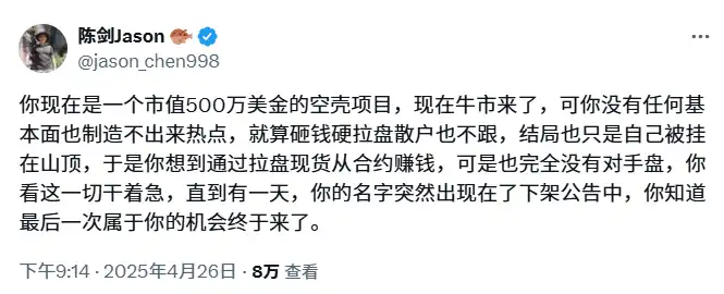 「下架 Binance」的消息对项目而言,通常是巨大的利空——下架意味着流动性减少、交易量萎缩,代币价格往往应声下跌甚至一蹶不振。