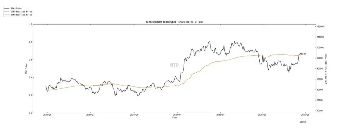市场突破短期持有者成本线 (93K) 且在附近价位有⼤量成交筹码,市场积极情绪和购买⼒都有少量回升。短期预期市场有很⼤可能在当前价位震荡后继续轧空,当前⾯临回调的⻛险较低。