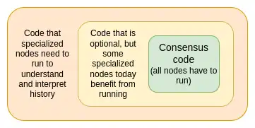 · 橙色和黄色区域的复杂性是封装复杂性,理解协议的人可跳过这些部分,以太坊实现可忽略它们,这些区域的错误不会引发共识风险。因此,橙色和黄色区域的代码复杂性远比绿色区域的复杂性危害小。