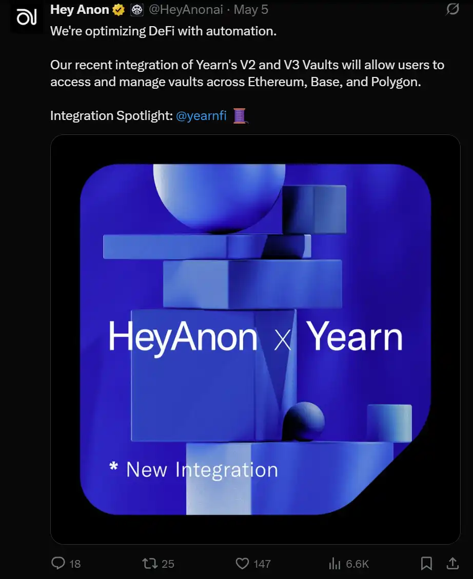 $ANON:@HeyAnonai 继续专注于 DeFai,推出了与 @yearnfi 的新集成: