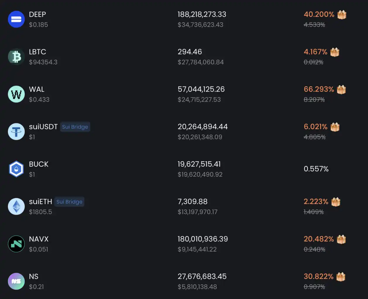 有趣的是,除了 SUI 本币外,以上空投的生态代币均未上线 Binance(没有交出筹码),且初使流通量较低。在 Sui 生态的 DeFi 协议中为这些代币提供了极高的存款利率,进一步锁住代币降低流通。