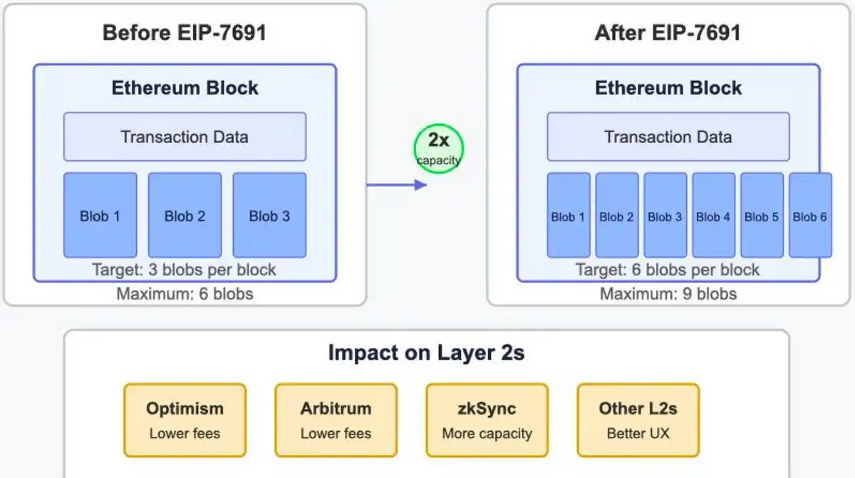 该提案通过将每个区块的 blob 数量翻倍(从 3 增加到 6,或从 6 增加到 9),提升了 Rollup 的数据容量。