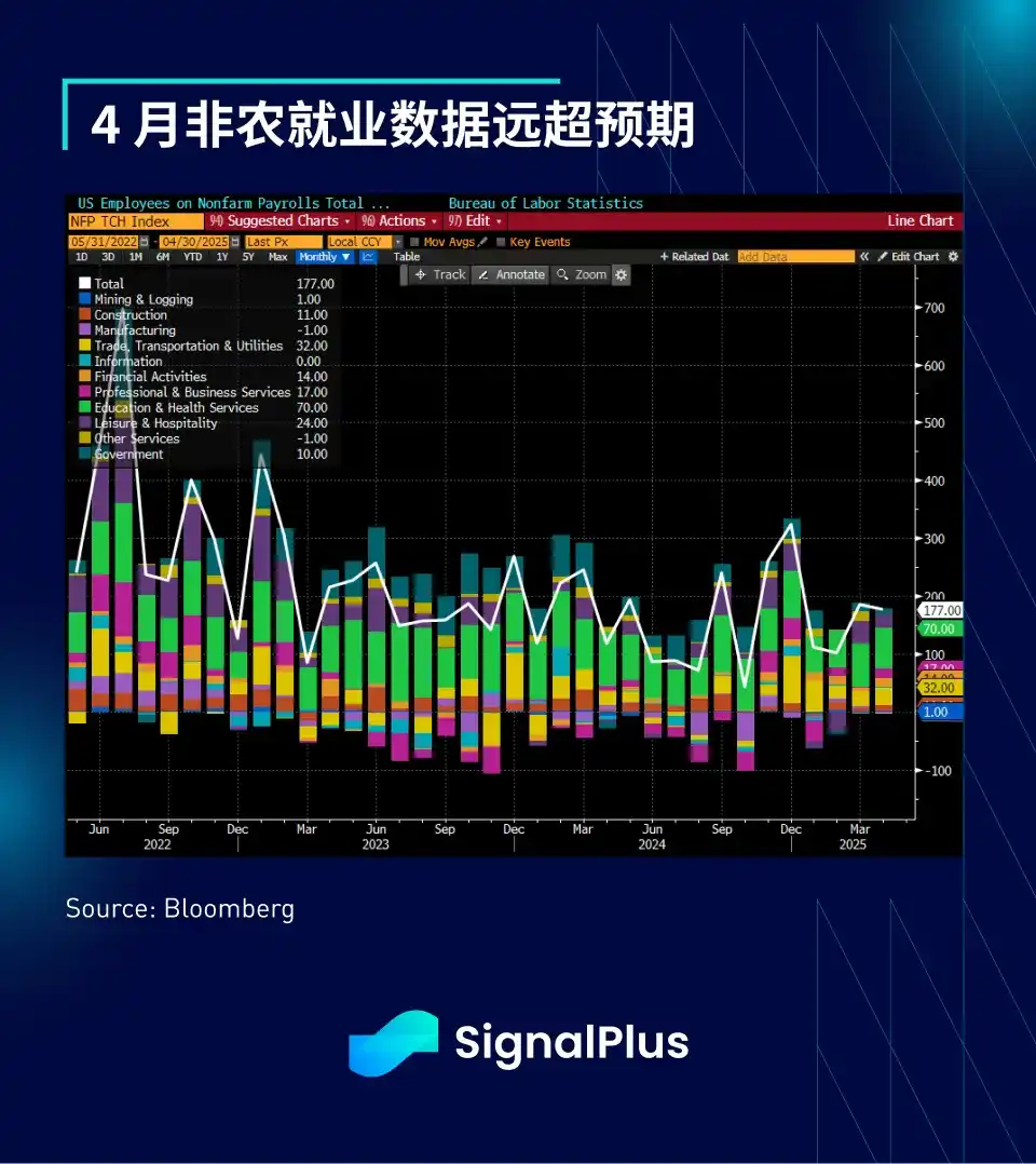 除了贸易方面释出正面讯号,上周五公布的非农就业报告也意外强劲,进一步推升了市场的风险偏好情绪,为一周的强劲经济数据画下句点,显示尽管市场存在负面情绪,美国经济基本面依然稳健。4 月新增就业人口 17.7 万,失业率维持在 4.2%,暂时打消了对经济即将陷入衰退的担忧。不过,关税政策的真正冲击可能要等到 5 至 6 月的数据才能反映出来。