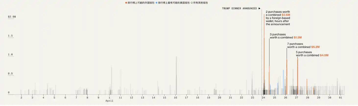 为了出现在晚宴排行榜上,购买了 TRUMP 币的人必须在其网站上注册,该网站称会根据持有的代币数量和持有时间对他们进行排名,许多持有大户尚未注册。但彭博社对所有最大买家(无论是否在排行榜上)的另一项分析显示,在这个更广泛的买家群体中,也有超过一半的人来自国外交易平台。