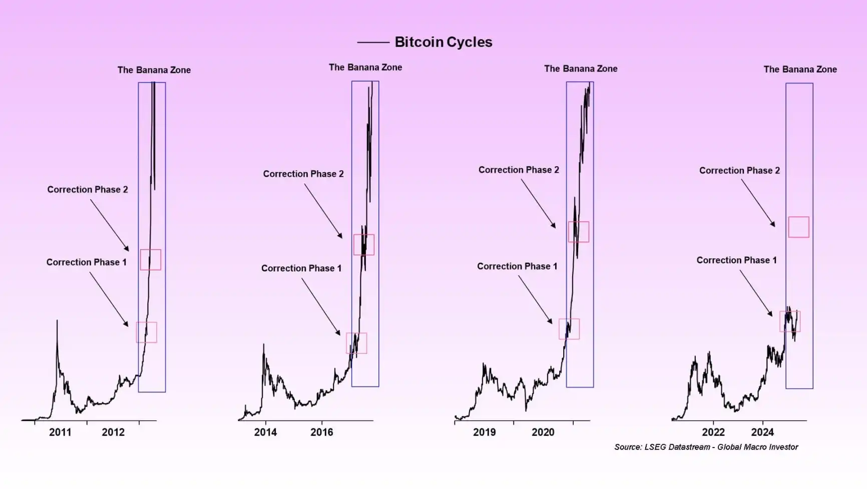9、全球 M2 与资产关系:当全球 M2 创新高时,资产价格理应同步上涨。以比特币为例,其价格走势通常呈现突破、回踩,然后在「香蕉区」加速上涨的特征。对比 2017 年周期,比特币当年涨幅达 23 倍,当前市场虽有所不同,但预计仍有可观涨幅。目前市场处于「香蕉区」第一部分突破后的修正阶段,即将进入第二部分,通常这一阶段将迎来山寨币行情。