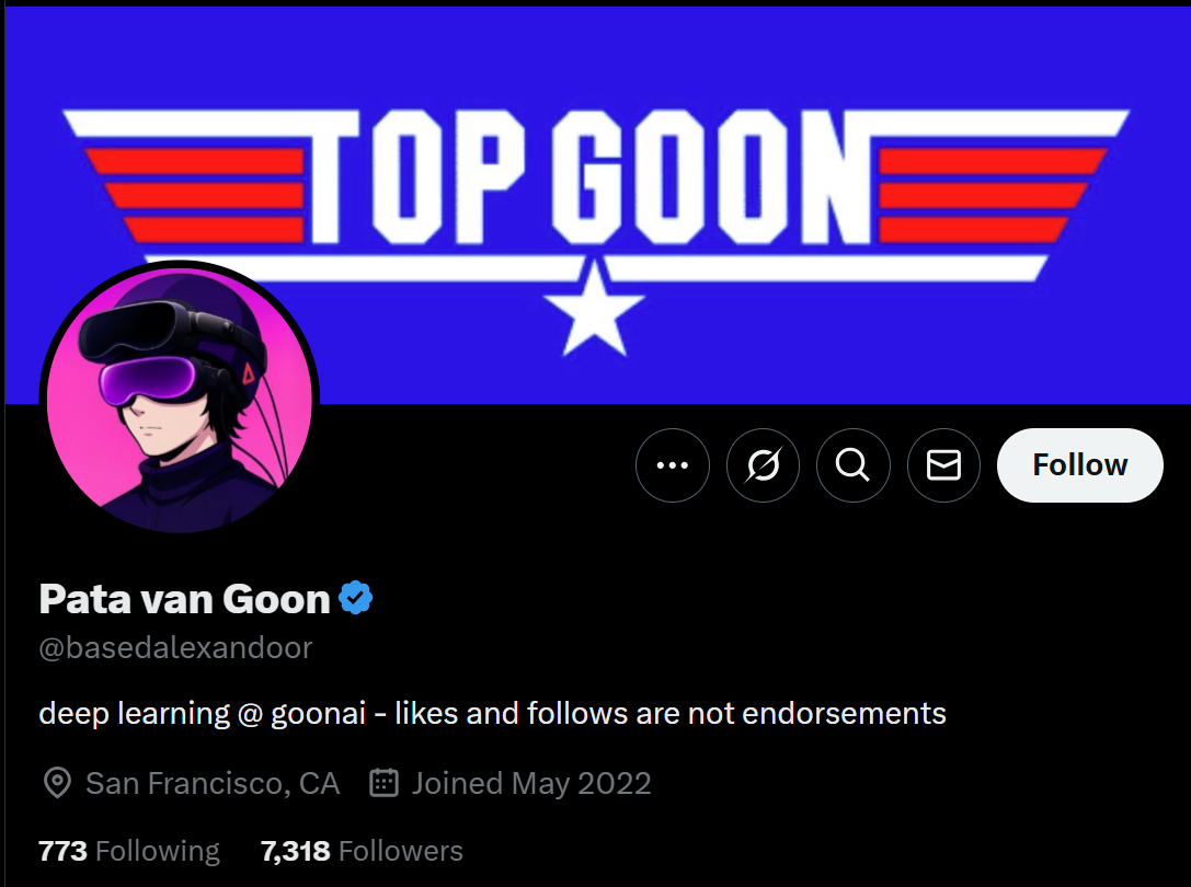 GOONC 幕后推手也不简单,也是讨论热度最高的的,X 平台上的 KOL @basedalexandoor(网名「Pata van Goon」)亲自下场,他的个人资料还得到了 a16z 联合创始人 Marc Andreessen 的关注,这让围观群众忍不住脑补 GOONC 是不是有点 OpenAI 血统。