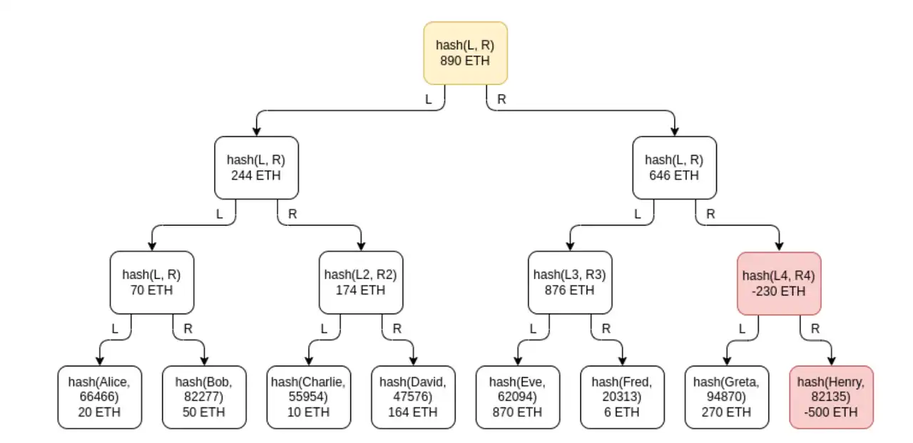 为什么要升级为 zk-STARK 技术?传统默克尔树证明方案存在漏洞,导致 CEX 有作恶的可能性。默克尔树是一种常见的数据结构,当它用于储备金证明时,它通过将每个账户的余额进行哈希处理并组织成树状结构,用于验证某个账户余额是否包含在交易所的负债总额中。但是,传统默克尔树有一个 关键缺陷:它无法防止负值节点。如果中心化交易所(CEX)想要作恶,可以通过创建假账户,并将这些账户的余额设置为负值,从而让储备看起来匹配负债,即便实际上不是。