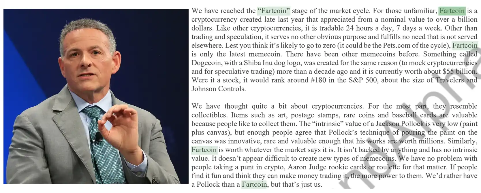 「我们正处于市场周期的 Fartcoin 阶段。」这话出自 David Einhorn——那个曾精准预测和做空雷曼兄弟的犹太亿万富翁,对冲基金 Greenlight Capital 的创始人。在 2024 年第四季度致投资人的信中,David Einhorn 用了整整一段话来分析 Fartcoin 的崛起,称它是「纯粹投机情绪的产物」,并将其与 Petscom、Dogecoin 并列为金融泡沫现象的典型代表。