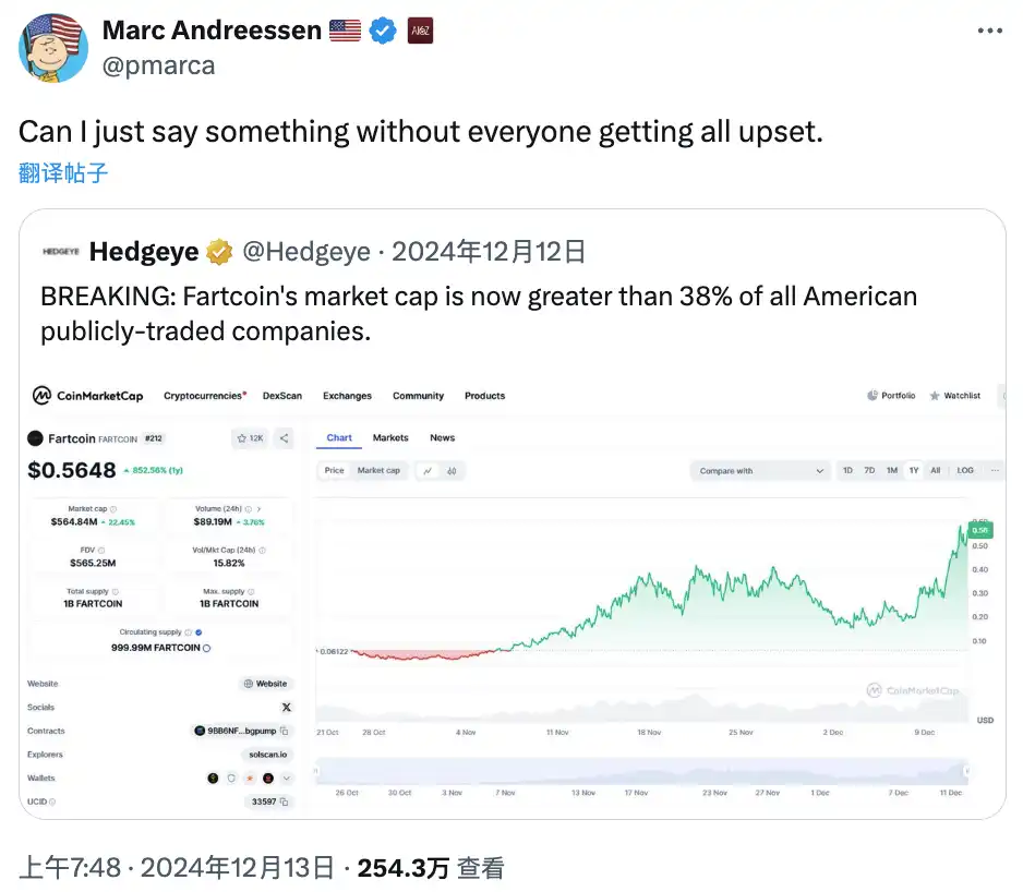 2024 年 12 月 13 日,一条关于 Fartcoin 的调侃推文迅速在 X(前 Twitter)上传播开来。让这条推文出圈的,不是它的内容多出挑,而是它的转发人:a16z 联合创始人 Marc Andreessen。