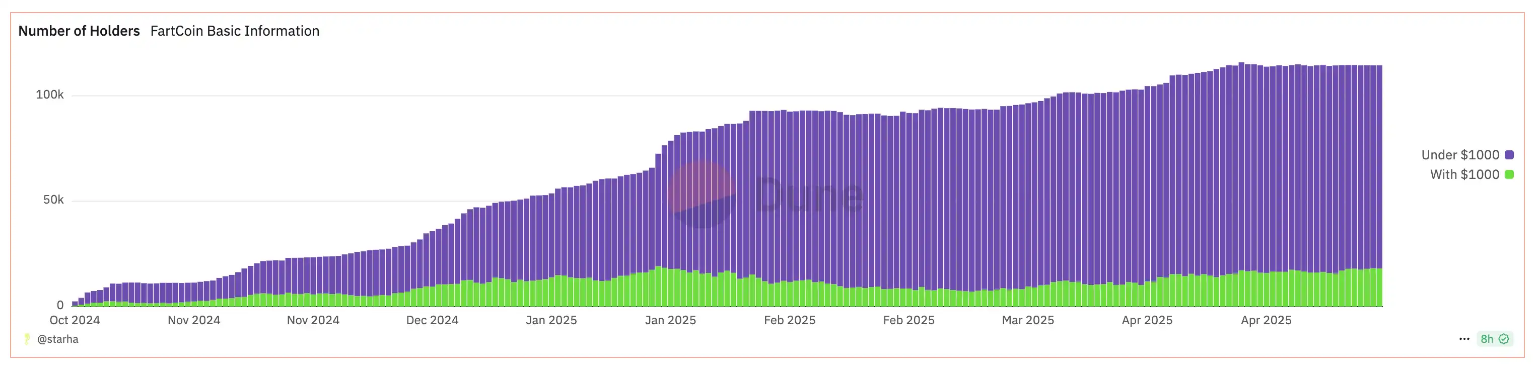 根据 Dune 和 BubbleMaps 的数据,从 2025 年 1 月 3 日到 5 月 9 日,Fartcoin 的筹码结构正从早期大户集中逐渐向散户分散扩展。