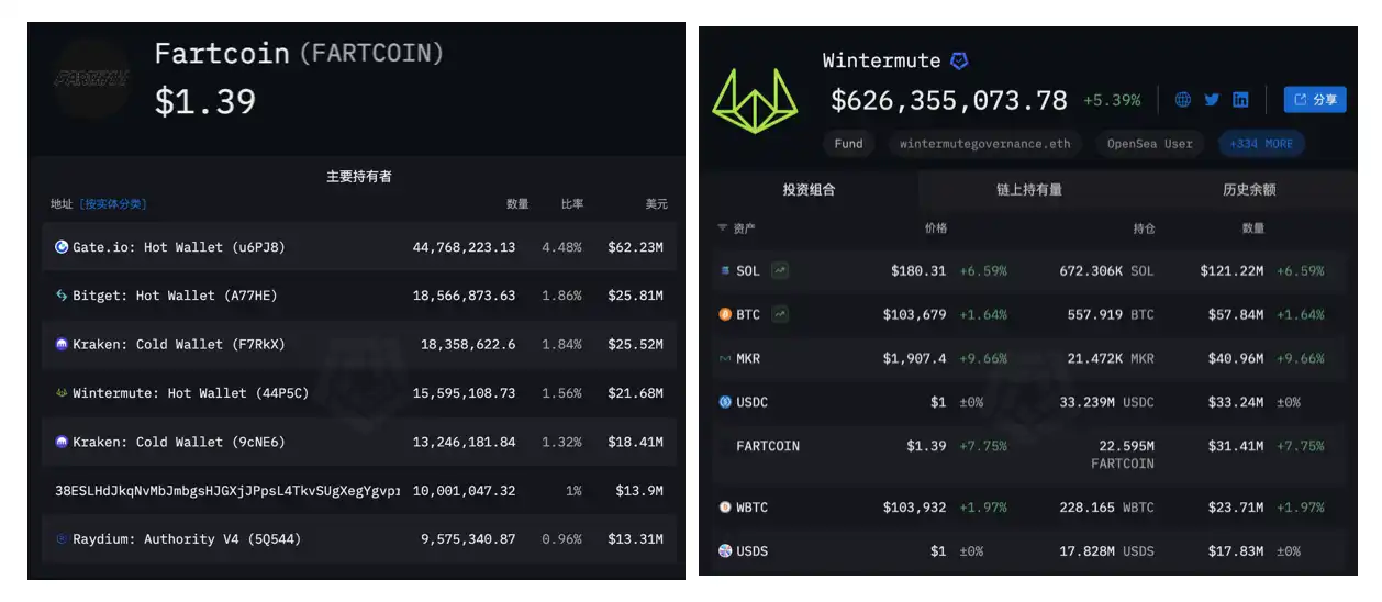 除此之外,还有更为活跃的角色登场——Wintermute,这家加密市场最大的做市商之一,其身影早早出现在 Fartcoin 的前排持仓中。据链上数据显示,Wintermute 持有 Fartcoin 占总供应量 1.56%,位列第四。在其主力地址的资产配置中,Fartcoin 高居前五,甚至高于一些主流资产。