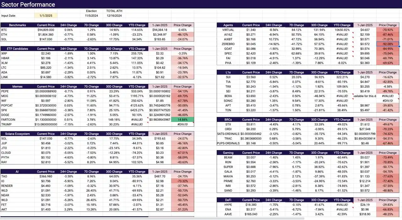 根据顶级交易员 Eugene(圈内称「鸽子」)的数据统计,2025 年第一季度,大部分主流资产都陷入明显回撤:ETH 年初至今下跌超过 46%,SOL 下跌 24%,AI、L1、DeFi、Gaming 等细分赛道更是一片深红,惨烈非常。而在这片血海中,Fartcoin 是整张图表中唯一的绿色,第一季度涨幅为 14.84%。在众多资产哀鸿遍野的背景下,Fartcoin 格外扎眼。