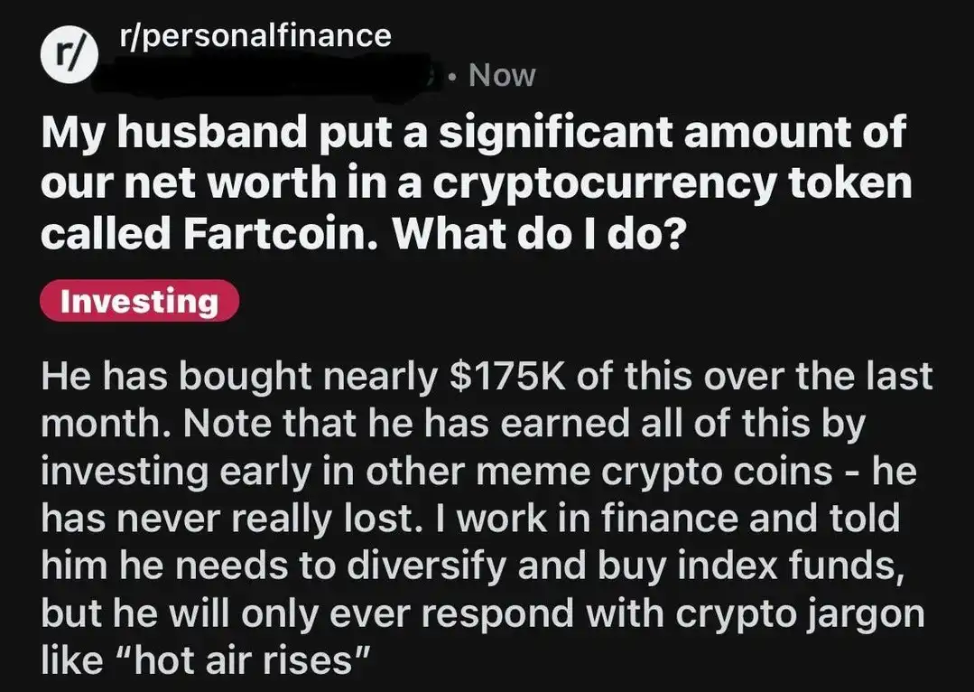 Fartcoin 梗图:我的丈夫将很大一部分家产投入了一个叫 Fartcoin 的加密货币代币,我该怎么办?