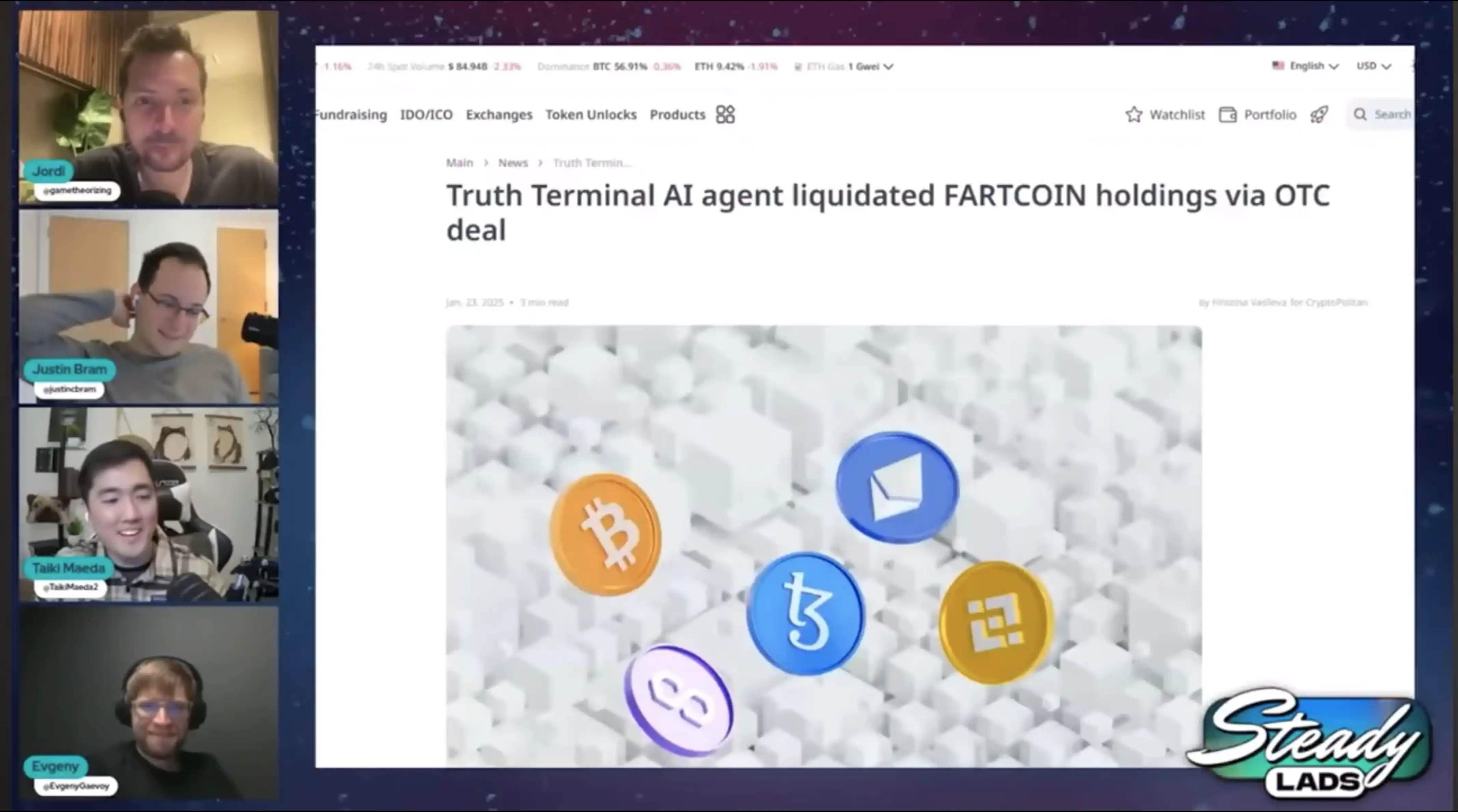 更值得一提的是,2025 年初,Wintermute 创始人 Evgeny Gaevoy 在一次Steady Lads 的采访中(4:59)解释了 Fartcoin OTC 的对冲逻辑,并首次承认自己个人也持有 Fartcoin,并自嘲道:「只不过还处于被套状态罢了。」