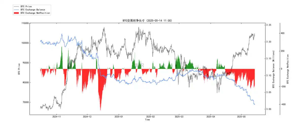 • 红⾊条 (>1000 万美元): 在价格上涨⾄⾼位后,出现了⼀些间歇性的净流⼊(⼤⼾可能在套现或进⾏⻛险管理),但并⾮持续⼤规模的流出到交易平台。最近⼏⽇,甚⾄有少量净流出(红⾊负值)。